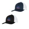 The Adjustable Trucker Hat is available in navy/white or black/white and includes an embroidered Oshawa swimming logo on the front.