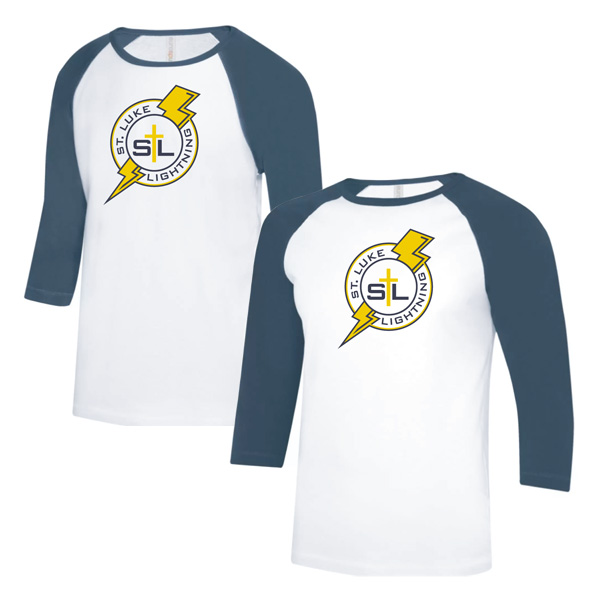 The Baseball Tee is tee is white with blue sleeve and includes a full front 3 colour DTF transfer logo.