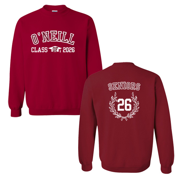 This Crewneck Sweatshirt is cardinal red and includes 1 colour silk screened “O’NEILL CLASS OF 2026” written