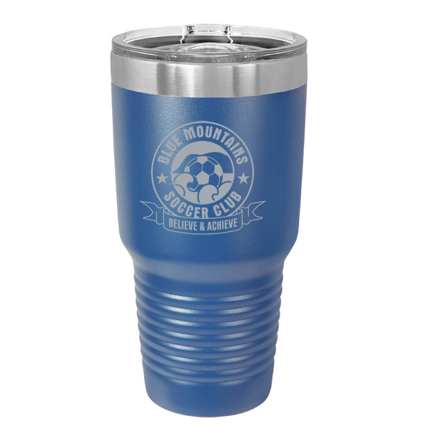 The Polar Camel Travel Mug is blue and includes a laser engraved logo.